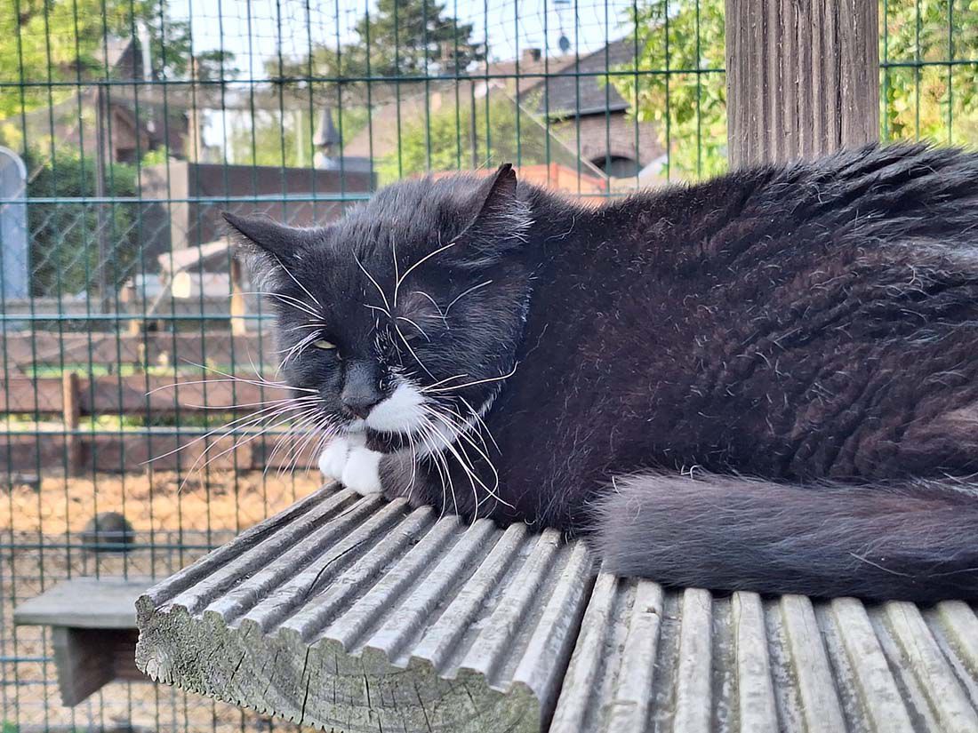 Viele Jahre habe ich als Streuner in einer Schrebergartenkolonie gelebt. Irgendwann war ich dort nicht mehr erwünscht und so hat mich ein lieber Tierschutzverein gerettet und an die MonRo-Ranch übergeben. Hier darf ich nun meinen Lebensabend verbringen, sicher, umsorgt und ohne Angst.